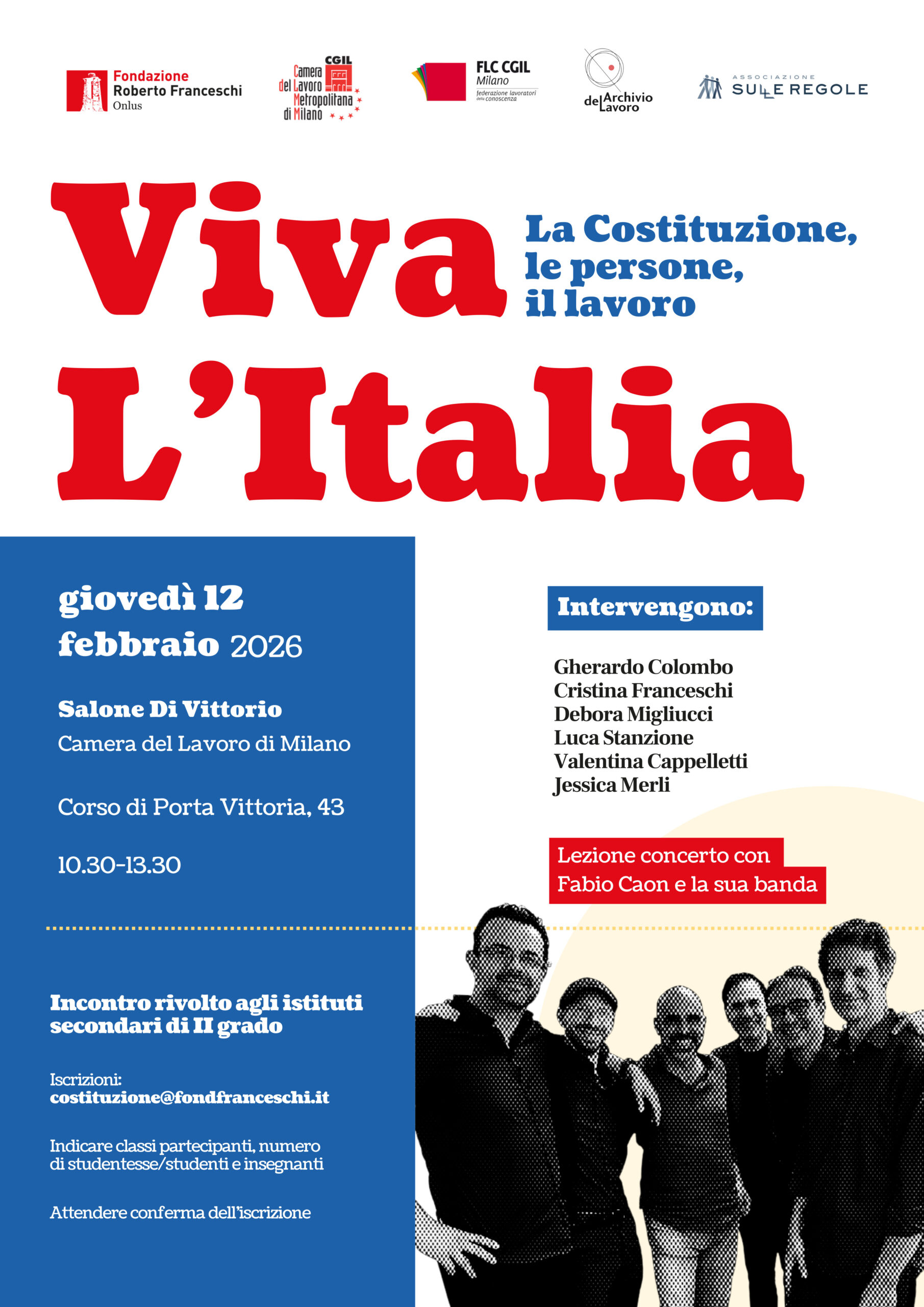 10:30 - 13:30 Viva l’Italia. La Costituzione, le persone, il lavoro – Lezione concerto con Fabio Caon e la sua banda alla Camera del Lavoro di Milano