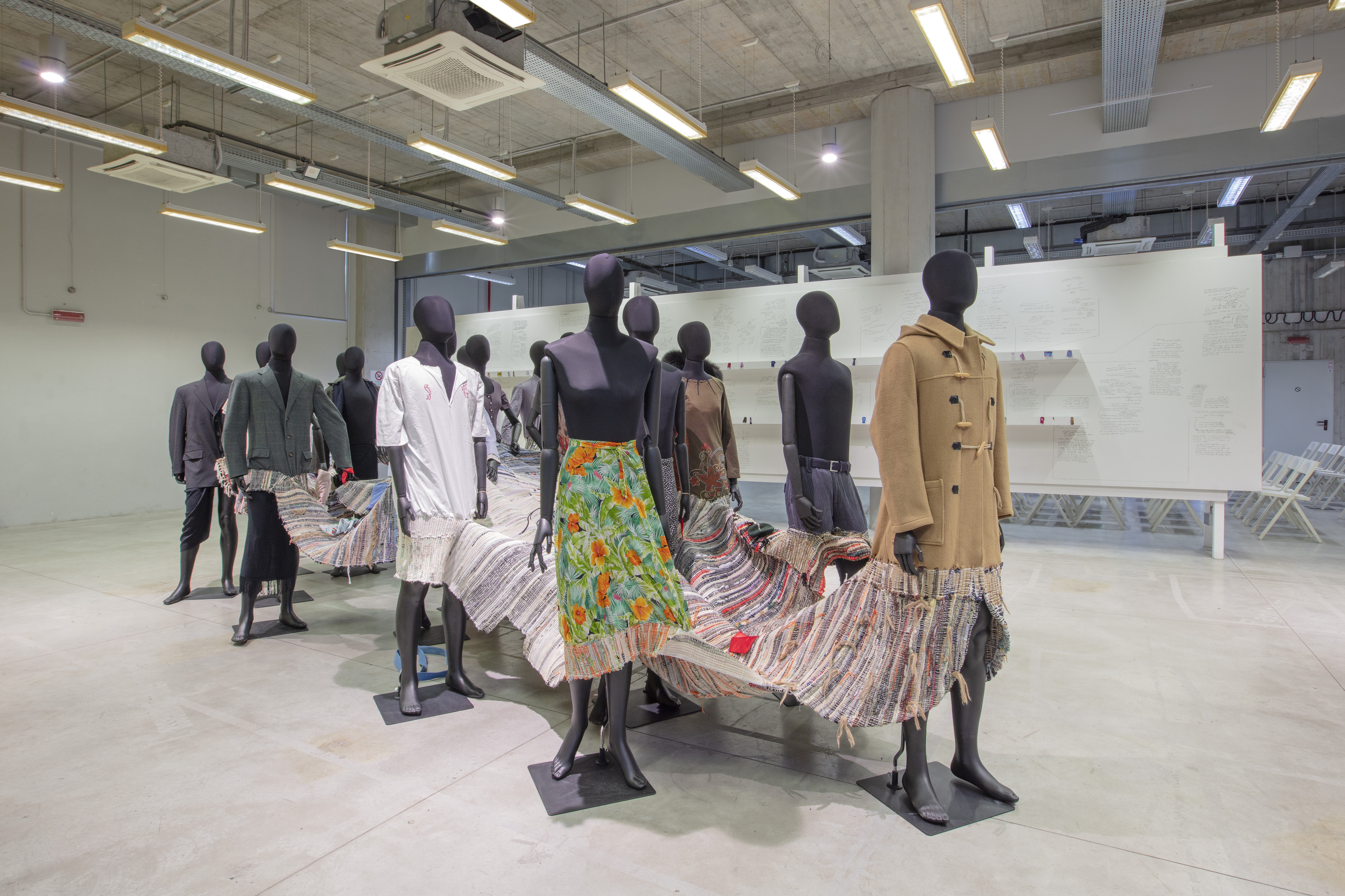 Il processo di preparazione degli indumenti per la tessitura al telaio e la scelta della loro disposizione nell’area della superficie dell’opera hanno avuto inizio nell’estate del 2023 a Sesto San Giovanni, nello spazio di ricerca e sperimentazione artistica della Farmacia Wurmkos con l’aiuto di alcuni membri del collettivo.